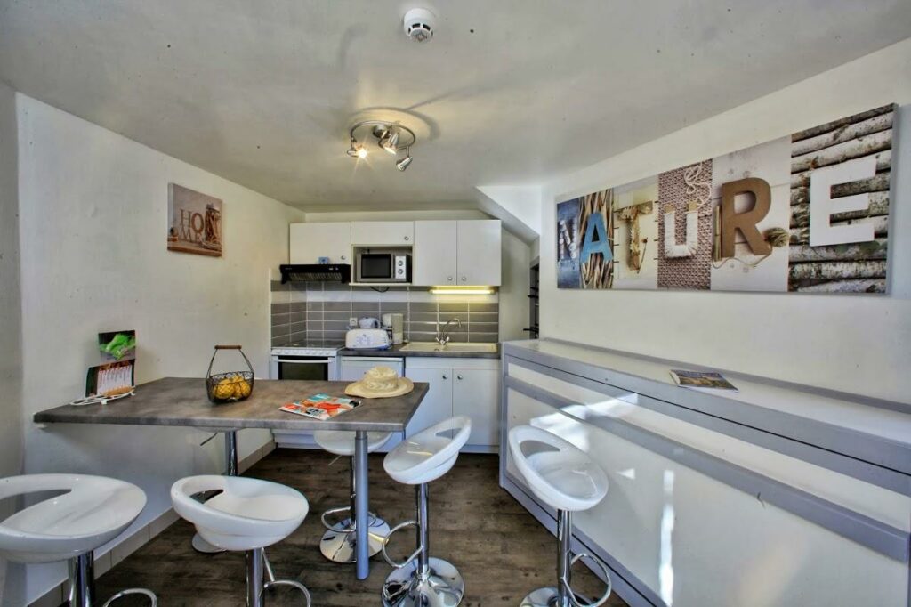 La cuisine est équipée de 4 feux gaz, vaisselle, micro-ondes, réfrigérateur/freezer, lave-vaisselle, four, cafetière, bouilloire et grille-pain. Vous y trouverez le quatrième couchage en lit rabattable.
